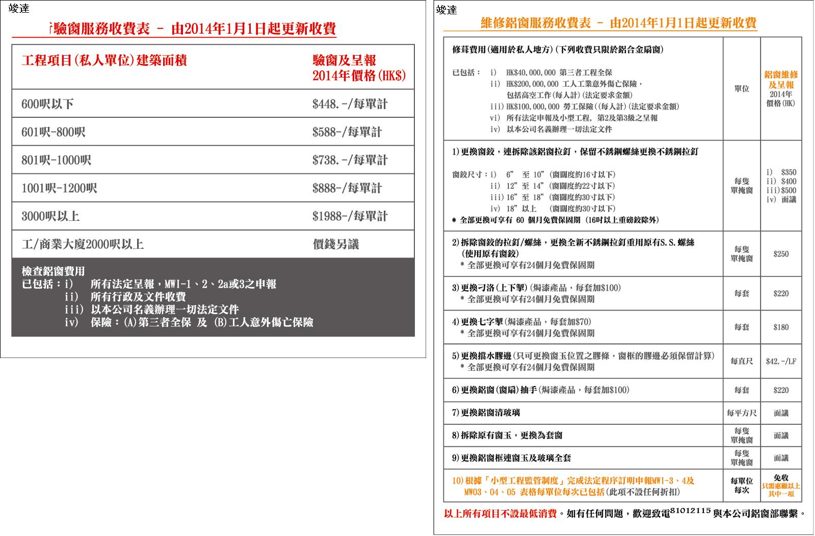 本公司為提高服務質素,新驗窗收費價目正式生效。 |